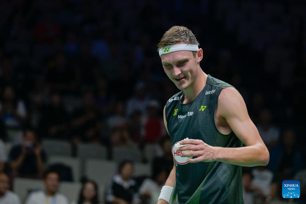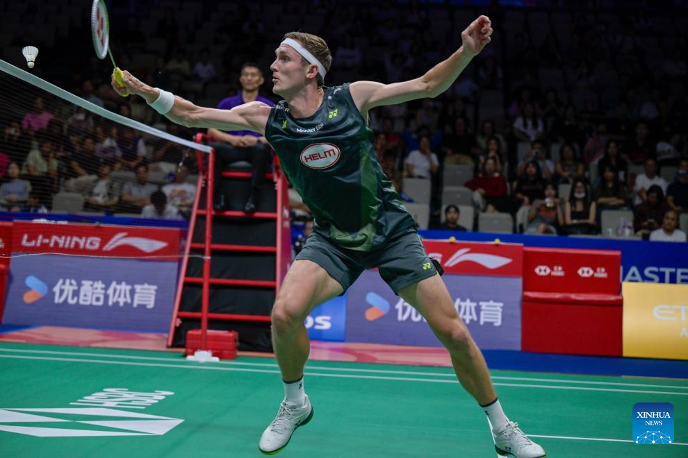 Viktor Axelsen of Denmark competes during the men's singles round of 16 match between Viktor Axelsen of Denmark and Alex Lanier of France at the China Masters 2025 in Shenzhen, south China's Guangdong Province, Sept. 18, 2025. (Photo by Chu Yan/Xinhua)