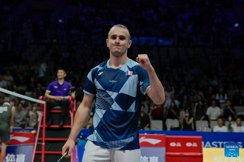 Alex Lanier of France reacts during the men's singles round of 16 match between Viktor Axelsen of Denmark and Alex Lanier of France at the China Masters 2025 in Shenzhen, south China's Guangdong Province, Sept. 18, 2025. (Photo by Chu Yan/Xinhua)