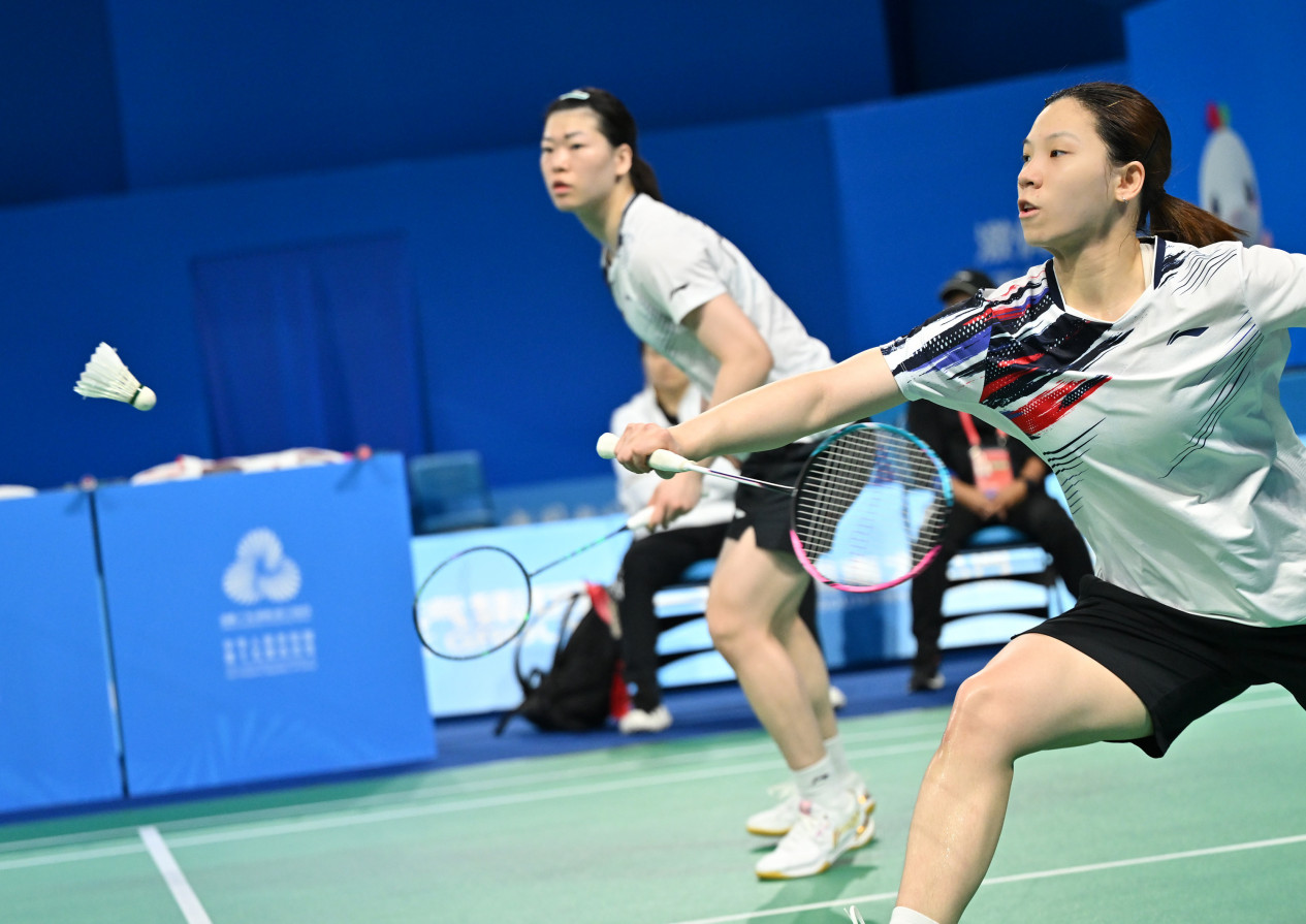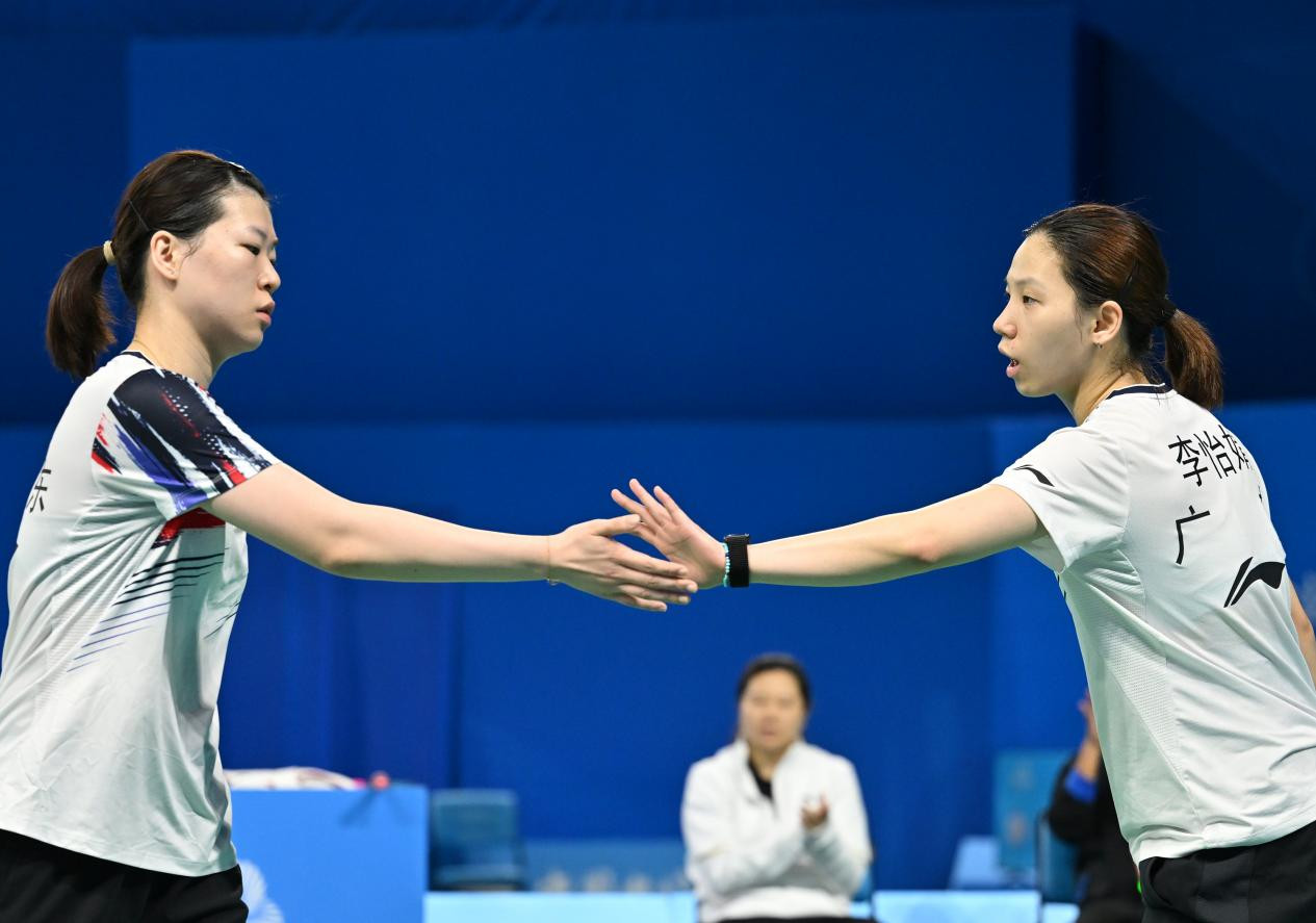 The Guangdong team pair Li Yijing (front) and Luo Xumin defeat the Shanghai team pair Luo Yi and Liao Lixi 2-0.