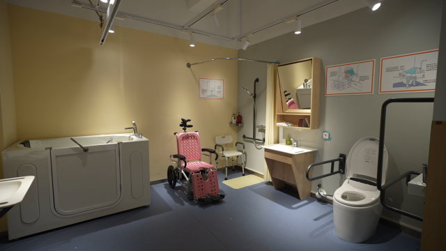 In the accessible home showroom, everything from the kitchen to the cabinets, toilet, and bathtub is smartly adjusted. The space features height-adjustable stoves and cabinets operated by infrared-free hand induction, and an overhead track system that can bear a load of around 100 to 150 kilograms to allow users with severe paralysis to be transferred smoothly.