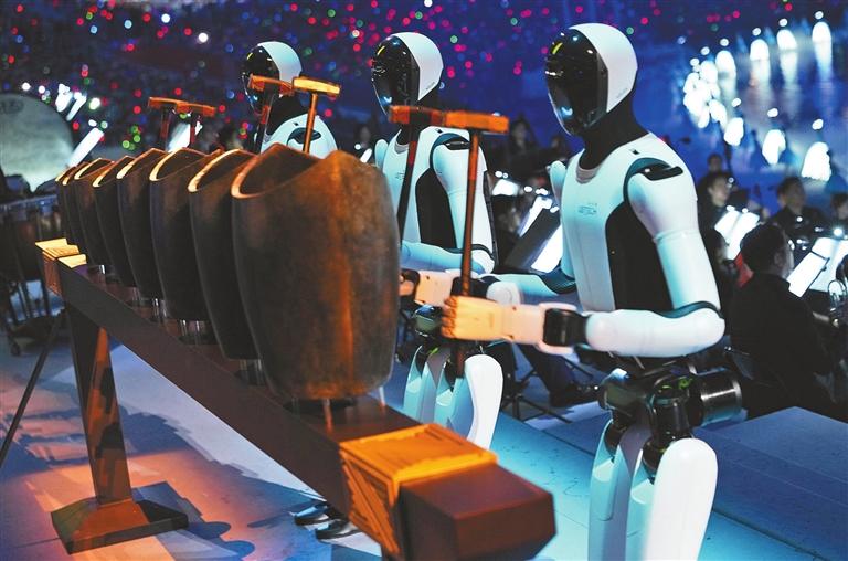 Three Walker S2 robots from Shenzhen-based UBTECH beat goudiao, an ancient bronze percussion instrument resembling chime bells, at the opening ceremony of the 15th National Games on Sunday night. Xinhua