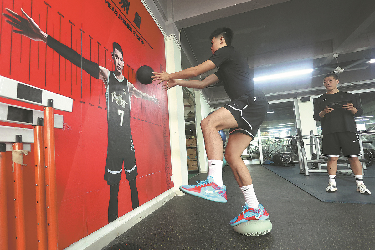 Cui Yongxi trains at Dongguan Basketball School. A mural of ex-NBA player Jeremy Lin serves as motivation for aspiring young players. WEI XIAOHAO/CHINA DAILY
