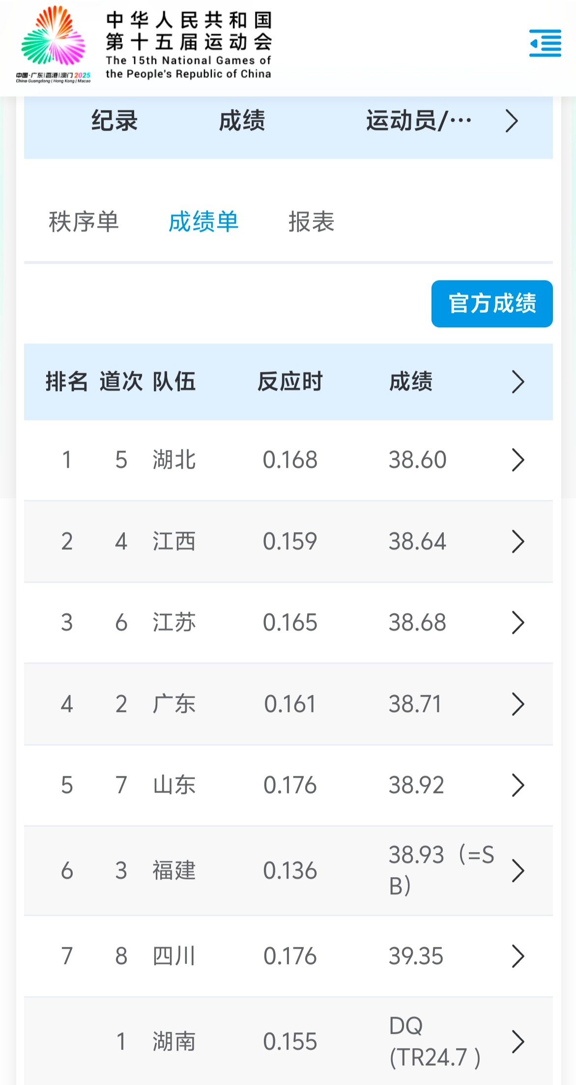 The Men's 100-Meter Relay, the most eye-catching event at China's 15th National Games, was held in Guangzhou on November 20. Led by Su Bingtian, holder of the Asian Record, Team Guangdong achieved 4th place with 38.71 seconds.