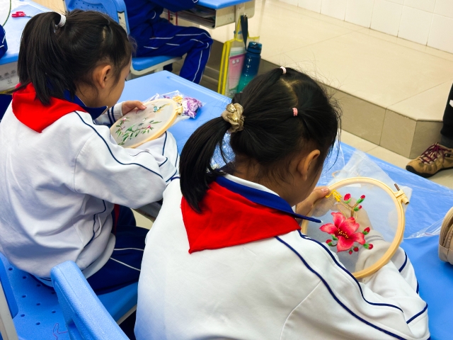 At Guangya Primary School, Cantonese embroidery has been part of the curriculum since 2016. The program progresses from simple patterns to creative designs, helping students develop patience and artistic skills. "We aim to enhance both technical ability and aesthetic appreciation," explains Li Min, an embroidery inheritor.