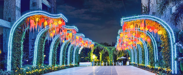 Instead of a typical city-square lantern fair, this one is set inside a botanical garden. Fifteen large lantern installations are set along forest paths, near streams, and on open lawns, turning the entire garden into a glowing landscape after sunset.