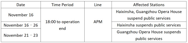 During the light festival, the APM Line's Haixinsha Station will skip stops starting at 18:00 daily, and Guangzhou Opera House Station will do so on Nov 16 (opening day) and from Nov 21 - 23 (Friday - Sunday) at 18:00.