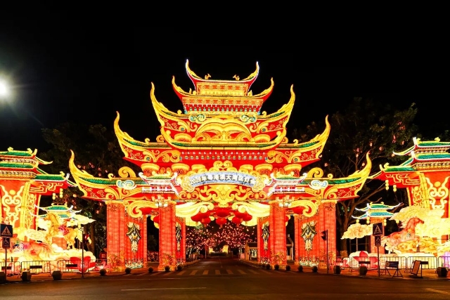 Set along the coastal promenade of Lufeng Shanghai Beach, this lantern fair blends marine scenery with local culture. The illuminated installations stretch along the shoreline, where glowing lanterns reflect off the waves and boardwalk, creating a vivid contrast between sea and sky.