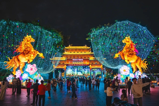 The largest public welfare lantern fair in Foshan features 13 themed installations along Bo'ai Lake, blending over 300 years of Le'an lantern craftsmanship with local culture and modern design. A 10-meter-tall "Le'an Lantern," crafted using traditional techniques, has become a popular photo spot. Horse-themed lanterns mark the Year of the Horse, while contemporary artistic designs reinterpret traditional lantern art.