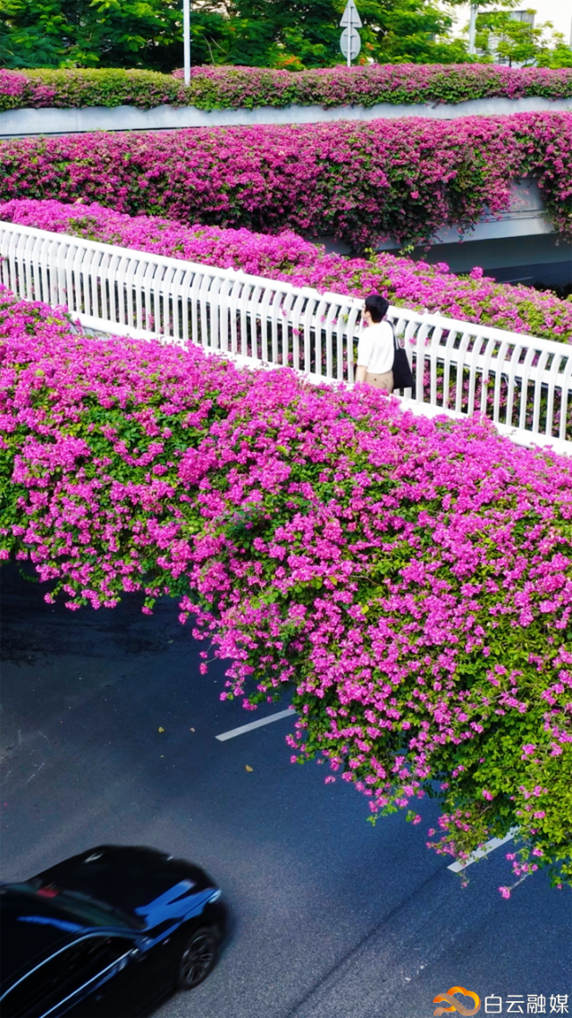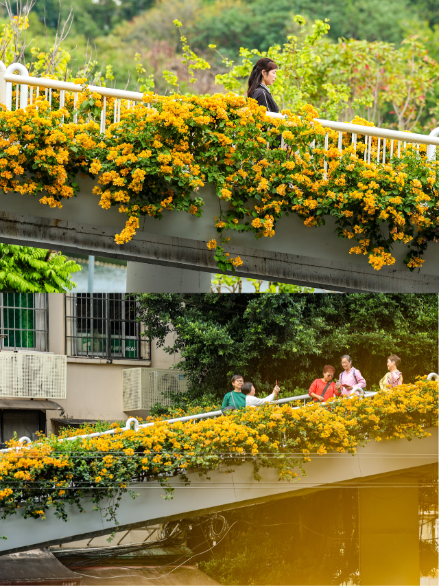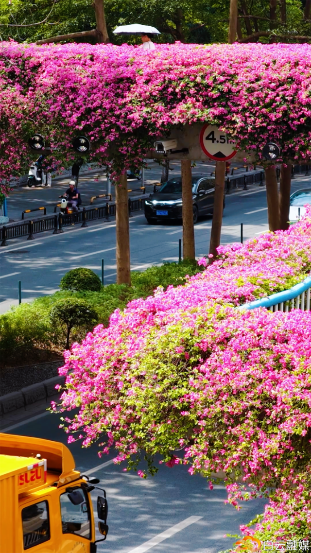 Bougainvillea, blooming from autumn through spring, is one of Guangzhou's defining seasonal sights. Pedestrian bridges, overpasses, and streets become vibrant "flower corridors." At Wuyang New Town Pedestrian Bridge, blossoms cascade like a floral curtain; near Chigang Metro Station, orange-red blooms frame views of Canton Tower; and no miss of the rare pale-yellow variety at the exits of Caihong Bridge Metro Station!
