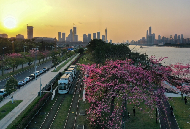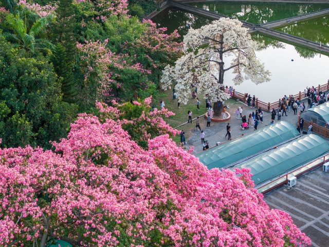 Across Guangzhou, silk floss trees burst into soft pink blooms that last into January. At Luhu Park, dense clusters form rosy clouds above shaded walkways. Along Tram Haizhu Line 1, blossoms drift past the windows like a moving dreamscape. For a rare sight, head to South China Normal University's Shipai Campus to see a white silk floss tree, its snow-like flowers bringing a serene touch to Guangzhou's warm winter.