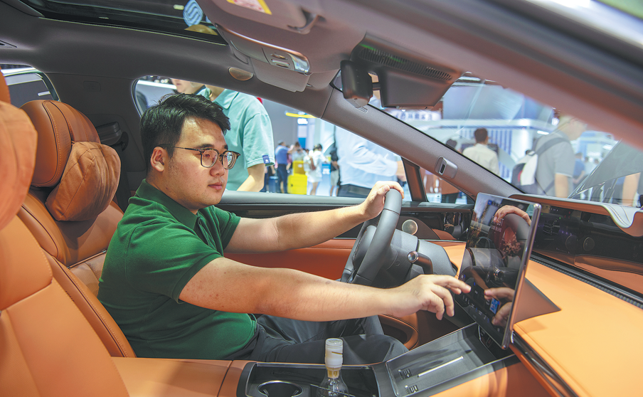 A visitor tries out a vehicle supported by Harmony OS during a tech expo in Guangzhou, Guangdong province, on Oct 10. CHINA DAILY