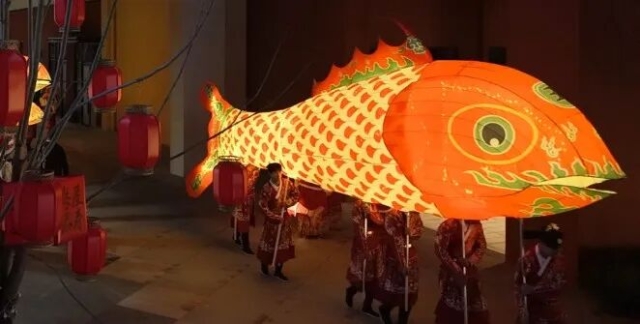 This Chinese New Year of the Horse, Danxia Mountain in Shaoguan, south China' Guangdong Province, welcomes the intangible cultural heritage fish lanterns from Anhui. The lanterns vary greatly in size—the longest is eight meters and needs six men to carry, while the one-meter-smallest can be held easily by one woman. They symbolize "surplus every year and a prosperous family".