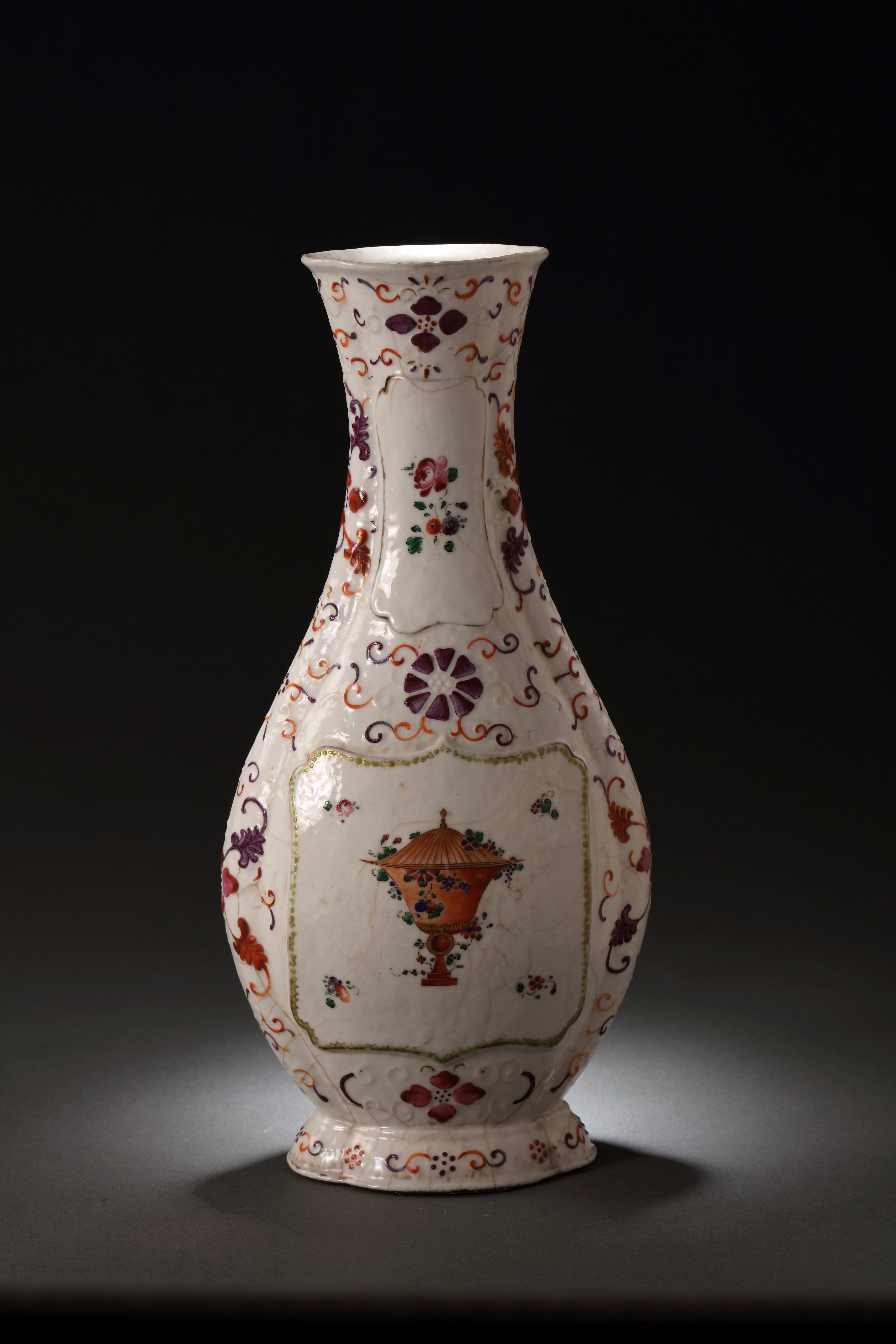 This vase is a classic example of 'Guangcai' (Canton porcelain) produced in the 18th century specifically for the European market. Its body features multiple molded, raised, and scrolling floral designs, showcasing distinct Rococo influences.