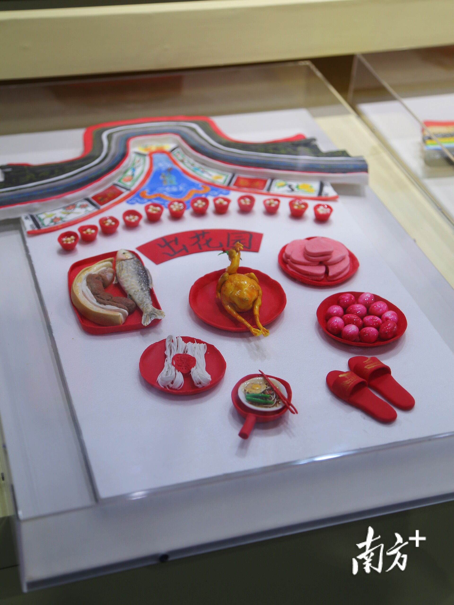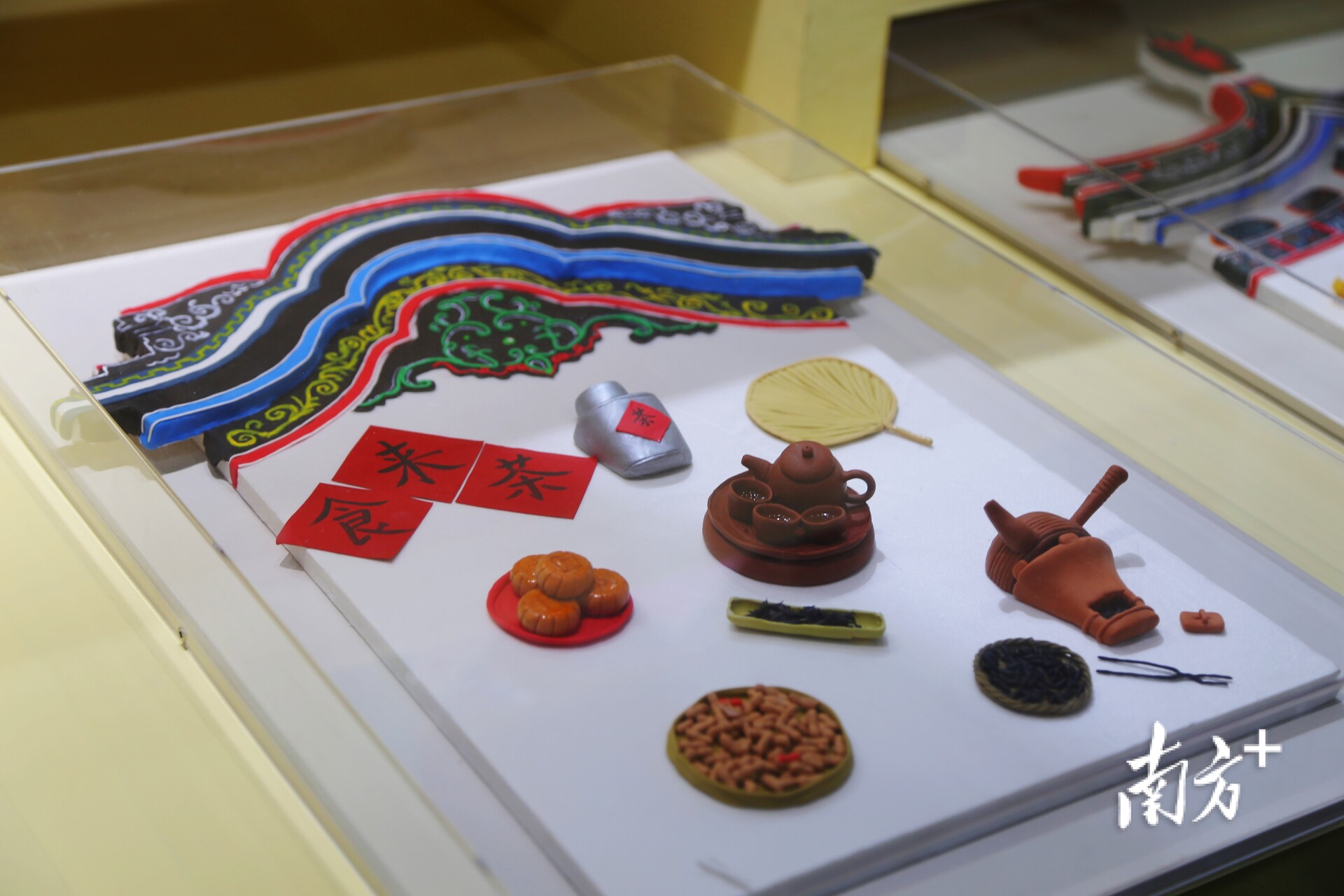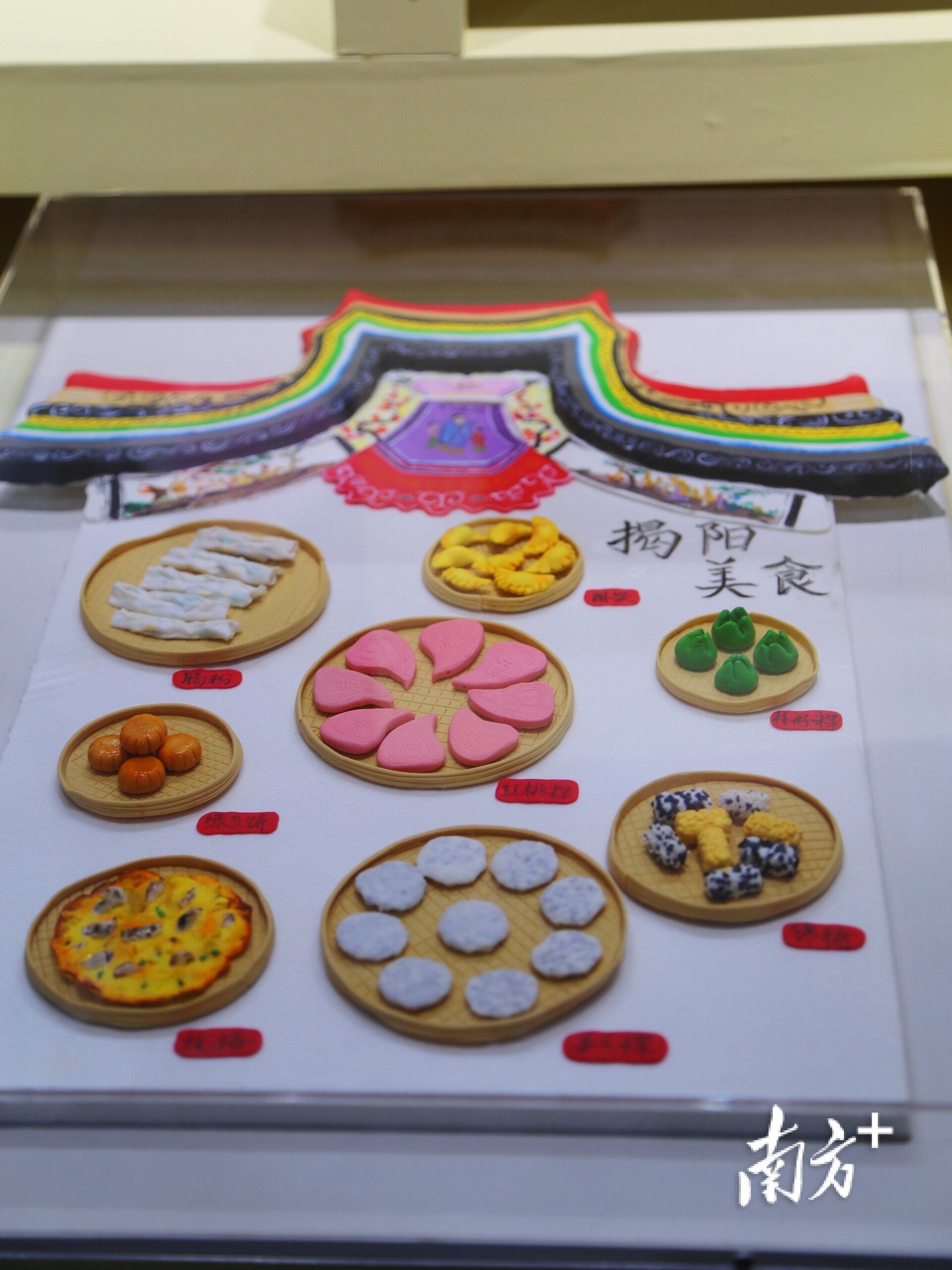 Another highlight was the display of "Jieyang dough figurine," a municipal-level intangible cultural heritage. A creative installation depicted five themes – local coming-of-age ceremonies ("Chu Huayuan"), specialty foods, Gongfu tea, intangible heritage, and Chaozhou opera – beneath miniature traditional roof decorations. A particularly popular piece was the dough sculpture group "Yingge · Chinese War Dance," which portrayed characters from the famed Puning Nanshan Yingge Dance as charming, stylized figures.