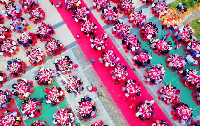 On February 13, a large open-air reunion dinner was held in the square of Kuanjiao Village, Huilong Town, Zhaoqing City, Guangdong, where 230 tables were set for nearly 2,000 residents to celebrate the Chinese New Year.