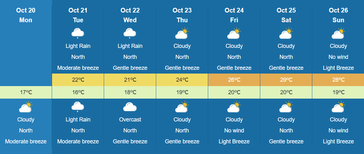 According to the Guangdong Meteorological Service, coastal areas in the Pearl River Delta and eastern Guangdong will see rain or thunderstorms, with heavier downpours likely on October 21. Minimum temperatures in the northern parts of the province could fall to 14°C–17°C, and even as low as 12°C in some inland areas by midweek. Coastal cities will remain milder, with lows around 18°C–21°C.