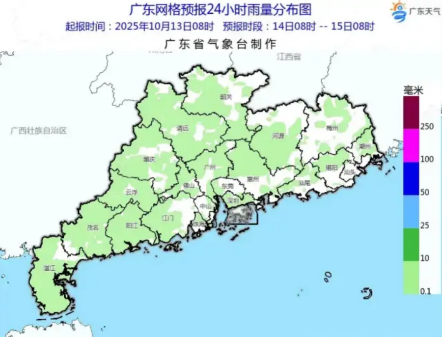On October 13, a southeasterly airflow will bring mostly cloudy to overcast conditions across much of the province, accompanied by scattered showers or thunderstorms and isolated heavy rain. Daytime highs are forecast to reach 31–33 °C in Shaoguan, Heyuan, and Meizhou, and around 28–31 °C in other areas.