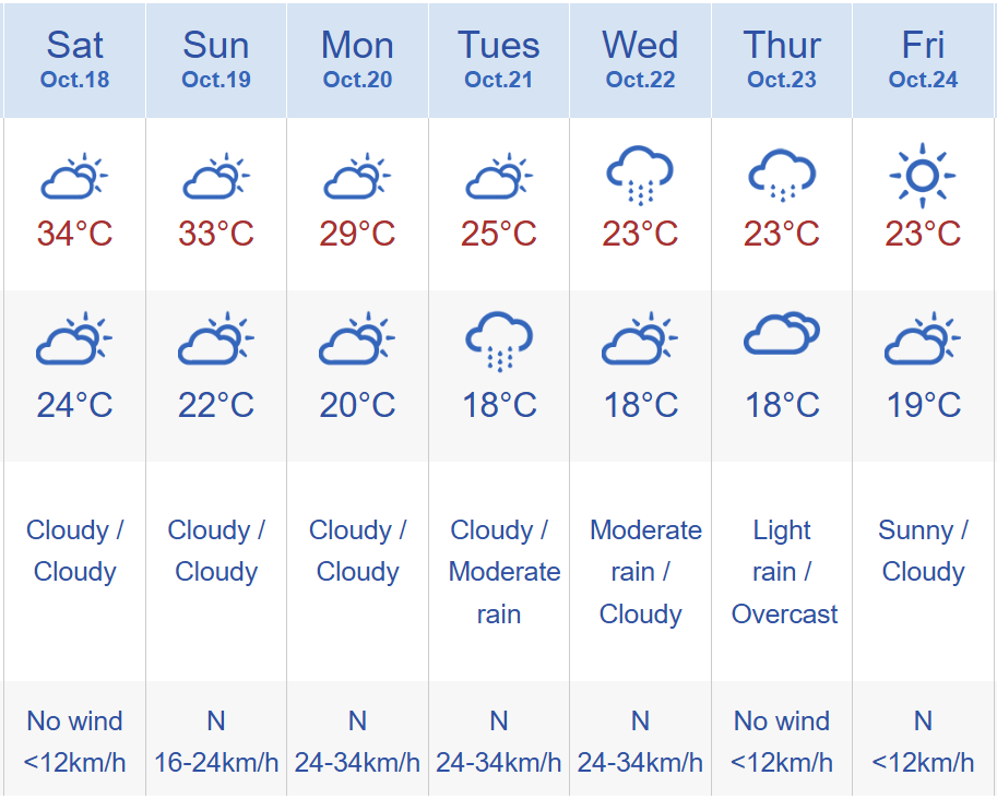 On October 18, Shaoguan, Qingyuan, and Zhaoqing will be cloudy to overcast with scattered (thunder) showers. Coastal cities and counties in the south will experience scattered (thunder) showers in the afternoon, while most other areas will be sunny to cloudy with isolated showers. Maximum temperatures will be 27–30°C in northern Shaoguan and northern Qingyuan, 30–32°C in other areas of northern Guangdong and coastal cities and counties in western Guangdong, and 33–35°C in most other regions.