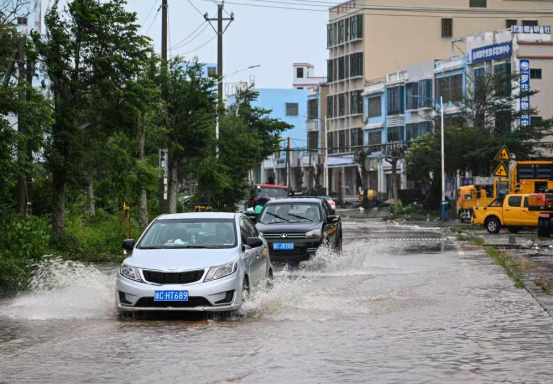 Vehicles navigate a flooded section of road in Hainan Province, following Typhoon Matmo.