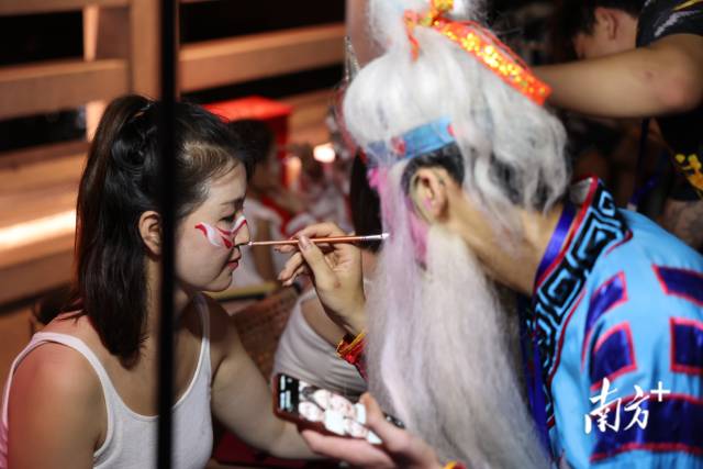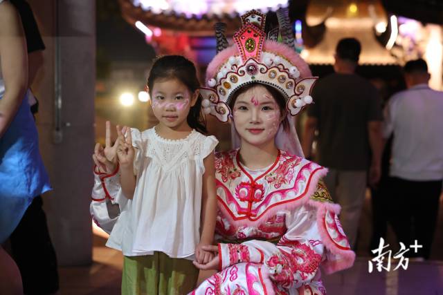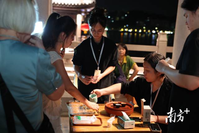 The intangible cultural heritage night show provides a rich cultural experience. Vibrant Yingge dancers captivate the audience with spirited performances. They wear traditional makeup and even invite tourists to have their faces painted—creating memorable photo opportunities. In dedicated seating areas on the bridge, guests can also savor Phoenix Dancong tea, a variety of oolong central to the Chaozhou gongfu tea ceremony, while enjoying the atmosphere.
