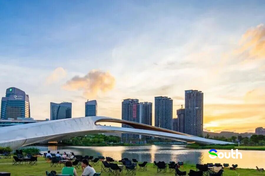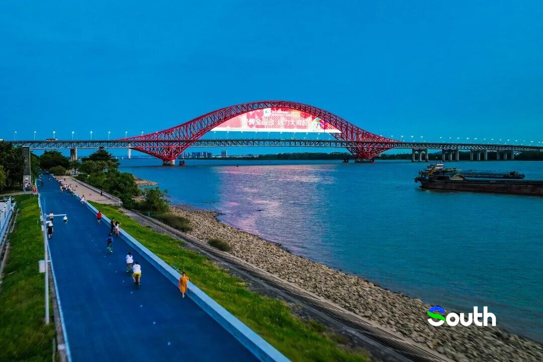 On a ride along Lovers' Road, the surging Lingdingyang Channel stretches to one side, while endless green lawns spread out on the other. By the river, you can see the Nansha International Convention and Exhibition Center, the Mingzhu Bay Bridge, and other city landmarks.