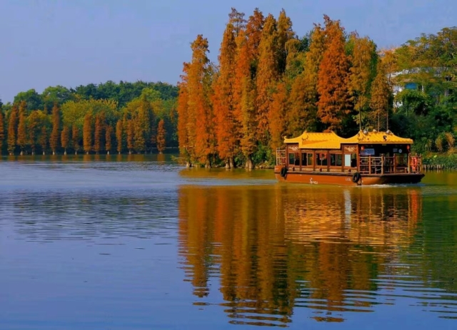 From this week onward, the bald cypress forest at the north gate of Seven Star Cave in Zhaoqing will enter its prime viewing period. The trees, tinged with shades of orange and amber, are beautifully reflected in the blue sky and clear waters, creating a warm and soothing scene that naturally lifts the mood.