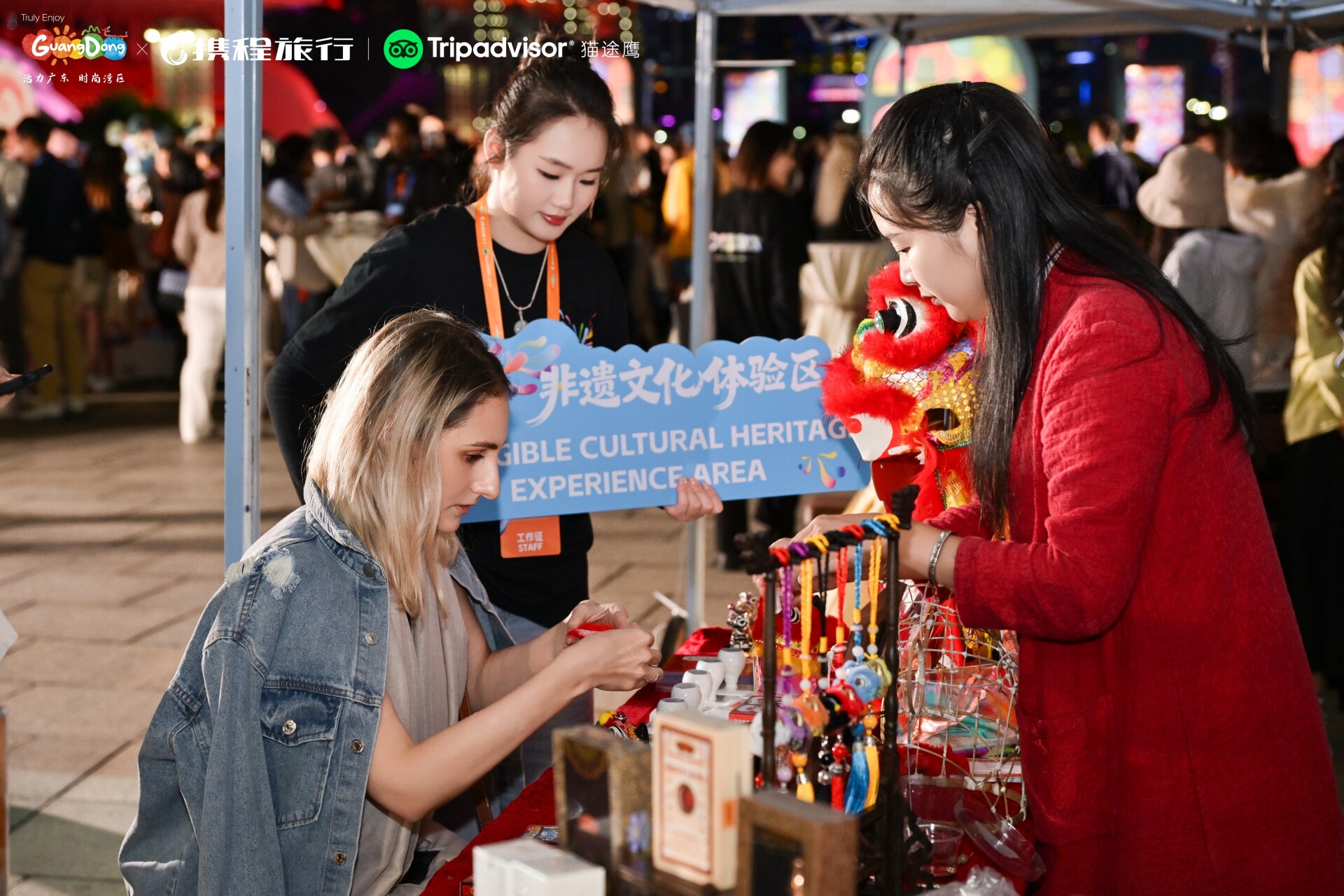 Visitors were greeted by both traditional and robotic lion dancers and gifted antique-style photo prints featuring Guangzhou's CBD skyline. Interactive zones offered hands-on experiences such as tax refund demos and encounters with eight forms of Lingnan intangible heritage, including Lu Feng shadow puppetry, Chaozhou gongfu tea, Dongguan incense craftsmanship, and Cantonese embroidery, allowing guests to "touch" and "feel" the living heritage of Guangdong.