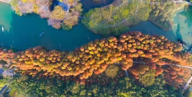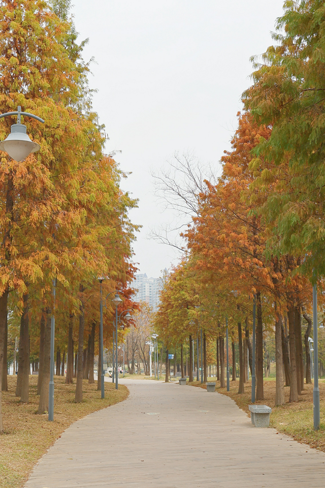 In December, rows of towering dawn redwoods stand gracefully by the water, creating perfect winter photo spots.