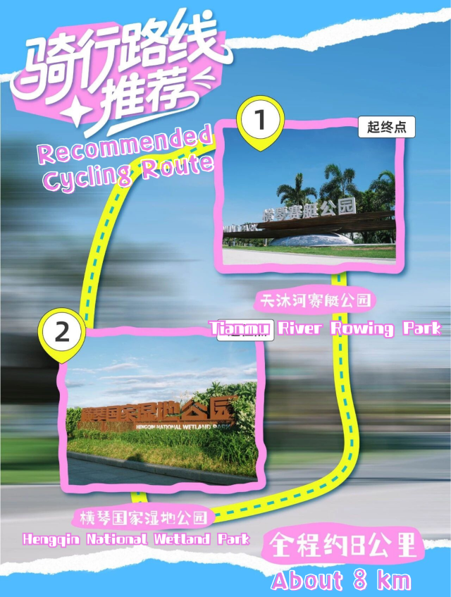 Start at Tianmu River Rowing Park, ride all the way to Hengqin National Wetland Park, then return along the same route. After the ride, treat yourself to a fine dinner nearby.