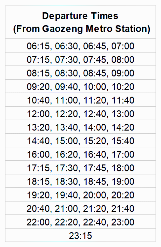 Schedule of the T3 shuttle bus from Gaozeng Station