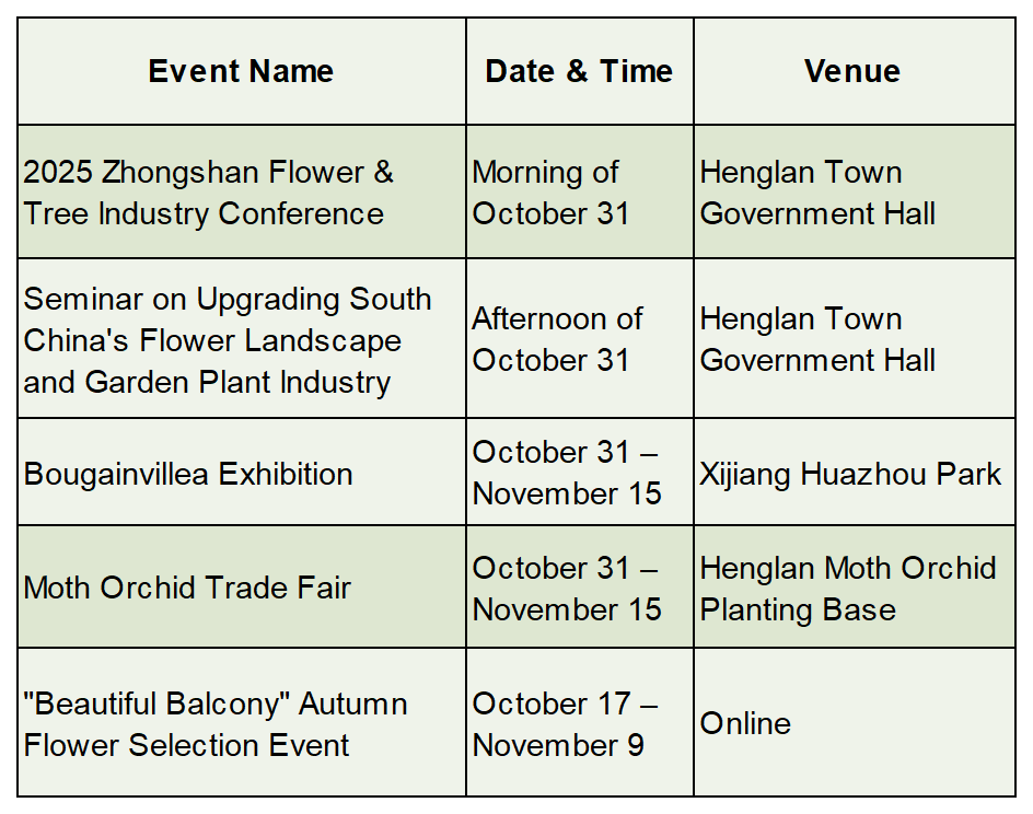 The 2025 Zhongshan Flower & Tree Industry Conference will open on October 31 in Henglan Town, Zhongshan. A seminar on upgrading South China's flower landscape and garden plant industry will also be held.